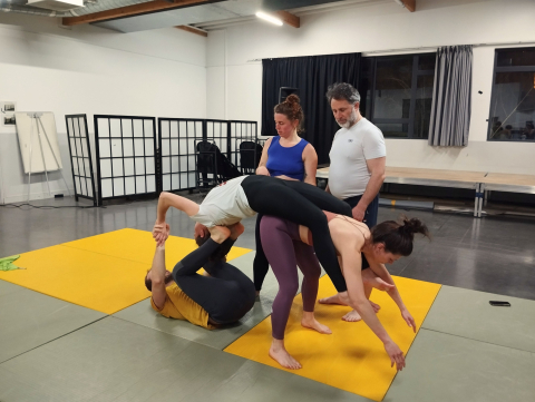 Cours d'acroyoga hebdomadaire niveau intermédiaire, tous les mardis de 19h30 à 21h, à la Maison pour tous François Villon (tram Tonnelles).