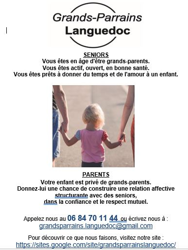 L’association ‘Grands-Parrains Languedoc’ créée en 2006 (loi de 1901), se propose de créer des relations affectives durables entre d’une part des enfants et. leurs parents, d’autre part des personnes, en général retraitées, disposées à se comporter à leur égard comme le feraient des grands-parents naturels, par un parrainage totalement bénévole.