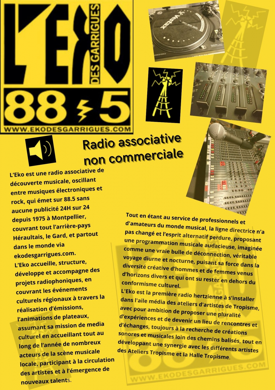 L’Eko est une radio associative de découverte musicale, oscillant entre musiques électroniques et rock, qui émet sur 88.5 sans aucune publicité 24H sur 24 depuis 1975 à Montpellier, couvrant tout l’arrière-pays Héraultais, le Gard, et partout dans le monde via ekodesgarrigues.com.