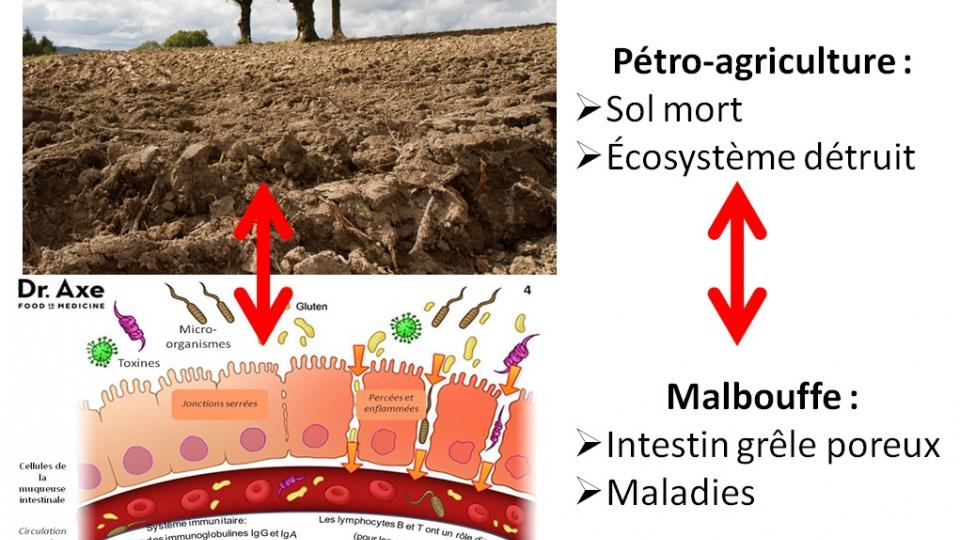 L'agriculture non biologique, c'est-à-dire pétrochimique, détruit la vie du sol, sert à produire des pétro-aliments qui détruisent le microbiote intestinal, et rendent le corps malade.