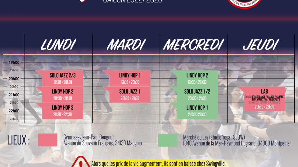 Swingville propose des cours de danse swing. Vous retrouverez le Lindy Hop, le Solo Jazz, et plusieurs cours thématiques comme le balboa, le charleston, ou bien le cabaret.