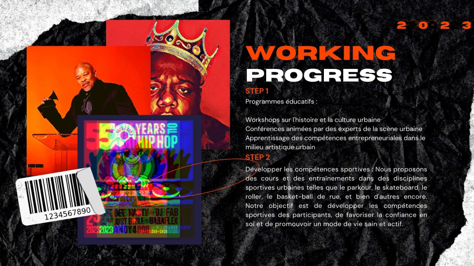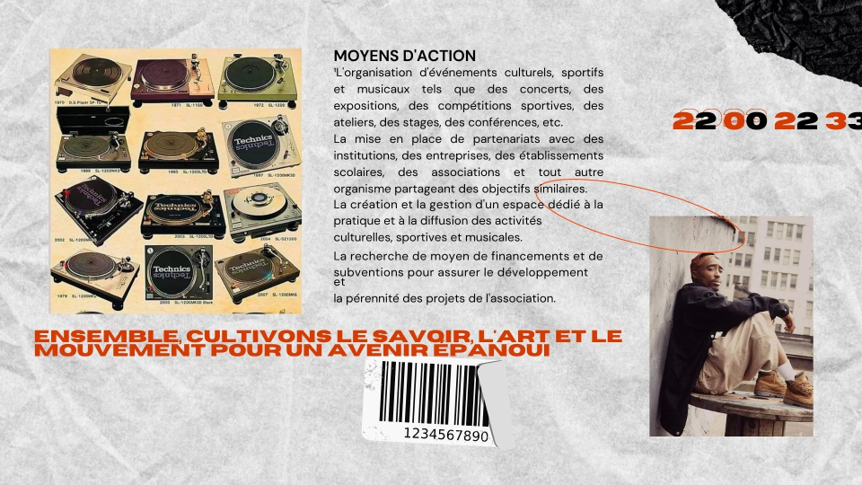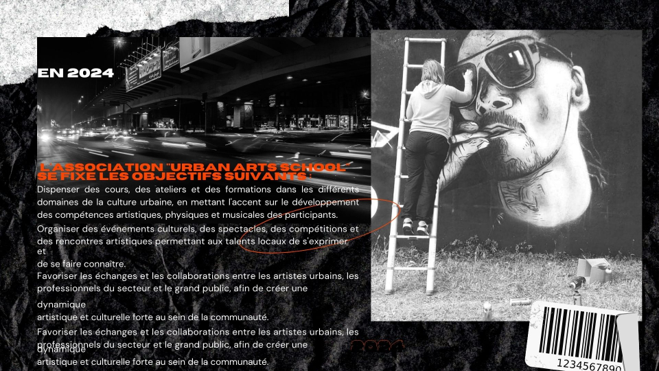 Promouvoir et développer les activités culturelles, sportives, et musicales liées à la culture urbaine, incluant la formation audiovisuelle et l'univers du cinéma, accentuant les diverses formes d'arts urbains, notamment le street art, le hip-hop.